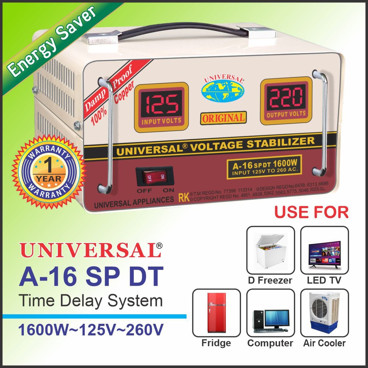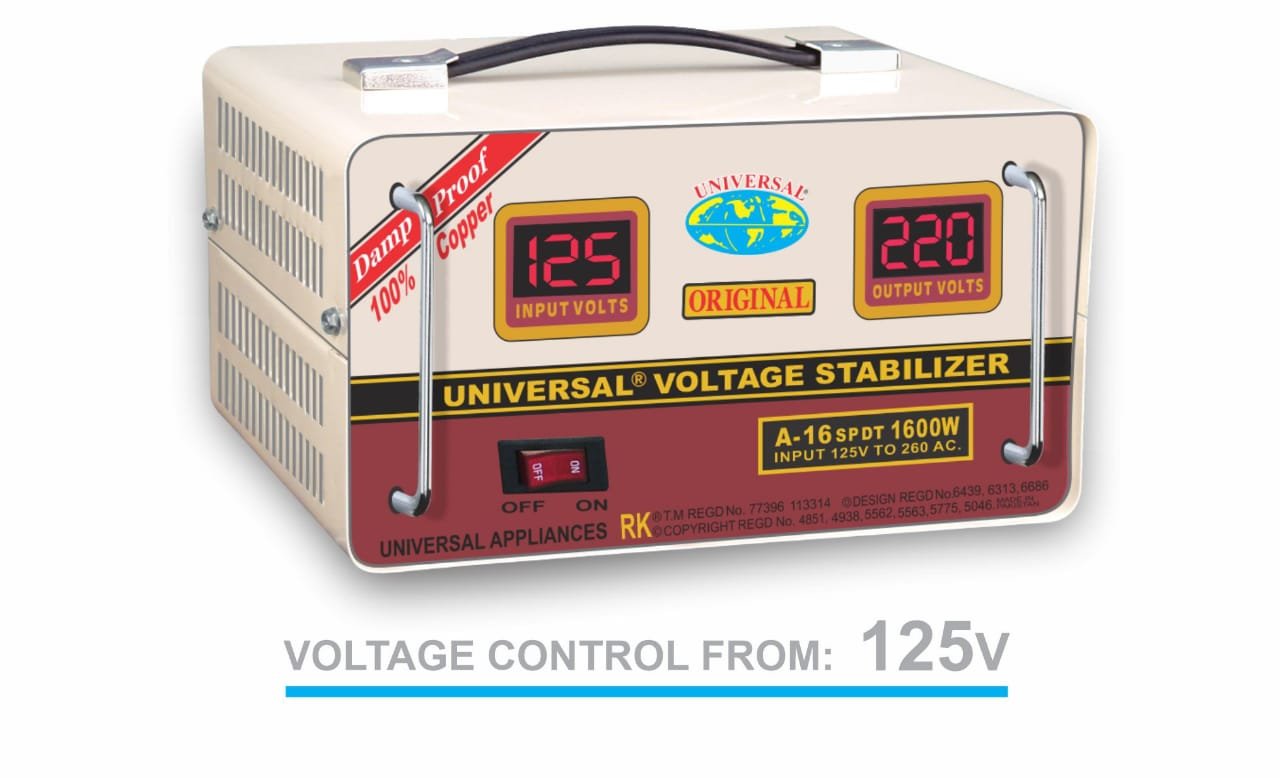 UNIVERSAL Voltage Stabilizer for Refrigerator, A16SP DT 1600watts 125V-270V